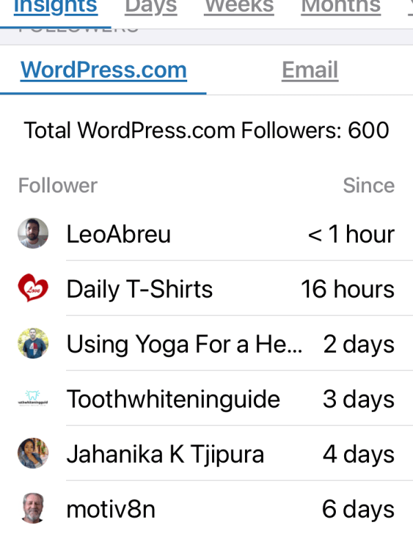 As you can see in my partial screenshot below, I now have 600 WordPress followers; that is, 600 people who have blogs like mine have subscribed to my posts! (I’m also followed by 20 people who aren’t bloggers themselves.)