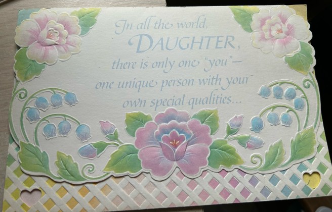 “DAUGHTER,” it proclaimed, in large capital letters on the front. Oh! I must’ve bought this for my daughter Kathryn’s November birthday, I figured, but then put it away and…? In any case, I kept reading:
