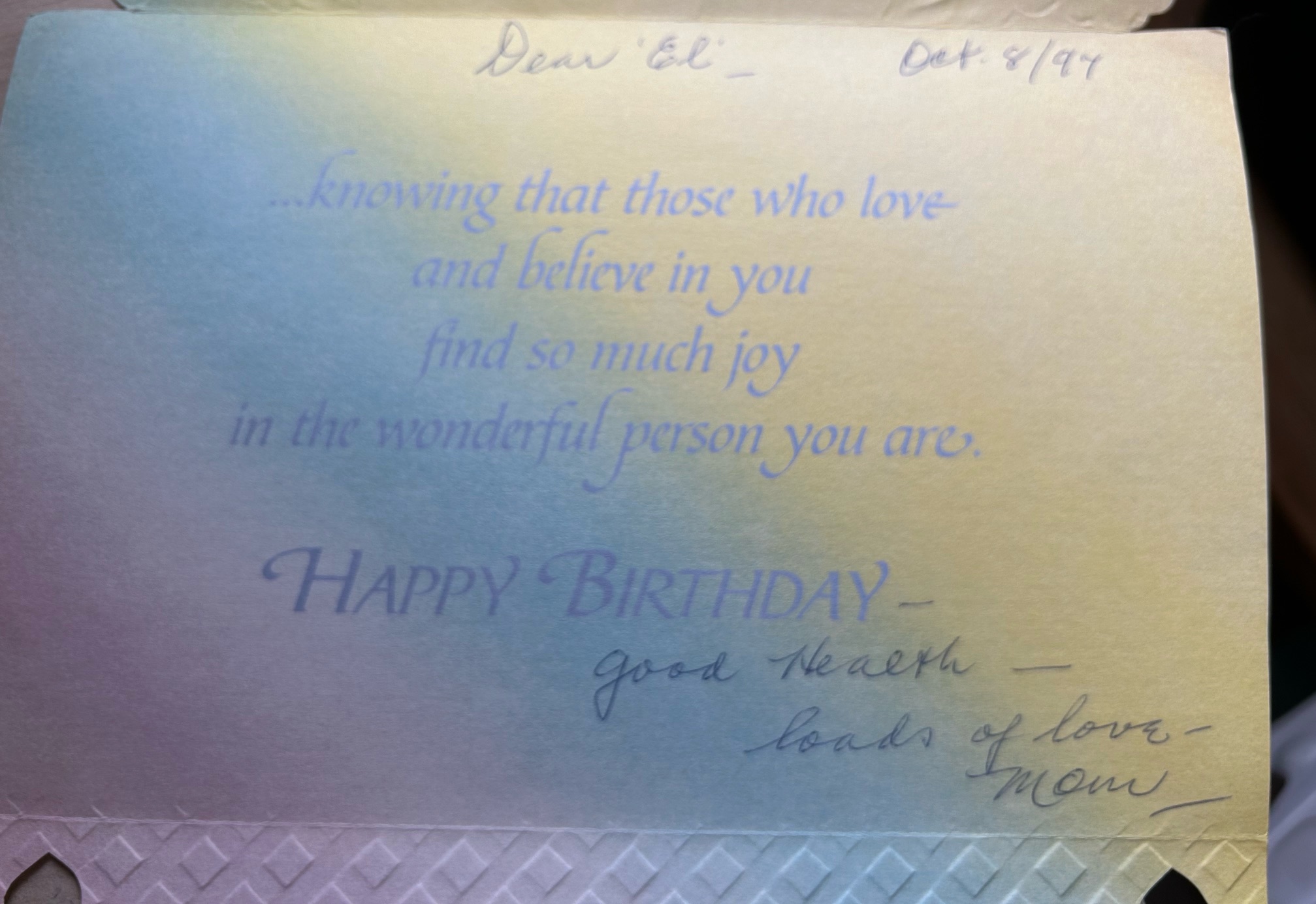 Oh. My. God. Sudden realization flooded my head and heart! “El” was my dear late mother’s nickname for me. She sent me this card! In 1997! I was about the same age then as my daughter is now.